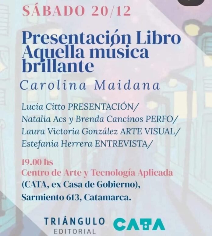 Este sábado, Carolina Maidana presentará oficialmente su primer libro de poesía, “Aquella música brillante”, bajo el sello de Triángulo Editorial, en el Centro Cultural y Tecnológico CATA, ubicado en el ex edificio de la Casa de Gobierno de Catamarca. El encuentro marca la llegada al formato papel de la obra, luego de su lanzamiento digital en enero de 2025 y de una primera y favorable recepción en medios digitales.